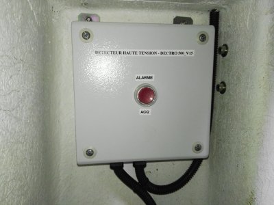 Système de prévention qui grâce à deux antennes de détection (ou trois suivant le type de nacelle) positionnées de part et autre de la nacelle, indique la présence de la ligne électrique "haute tension" dans l'environnement du panier.