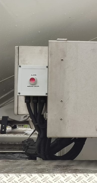 Système de prévention qui grâce à une seule antenne de détection sur le toit de la cabine du véhicule, indique la présence de la ligne électrique "haute tension" dans l'environnement du tapis avec asservissement de tous les mouvements de déplacement (la fonction Marche-Forcée permet le déblocage). DANGER: seuil de détection signalé par alarmes visuelle et sonore - blocage du tapis.